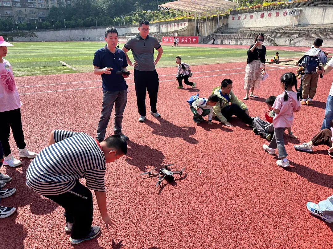 最令人期待的无人机炫酷秀如期上演!专业飞手操控无人机腾空而起,悬停、绕飞、低空穿梭,一系列流畅的动作带来了震撼的视觉体验,孩子们的欢呼声此起彼伏。