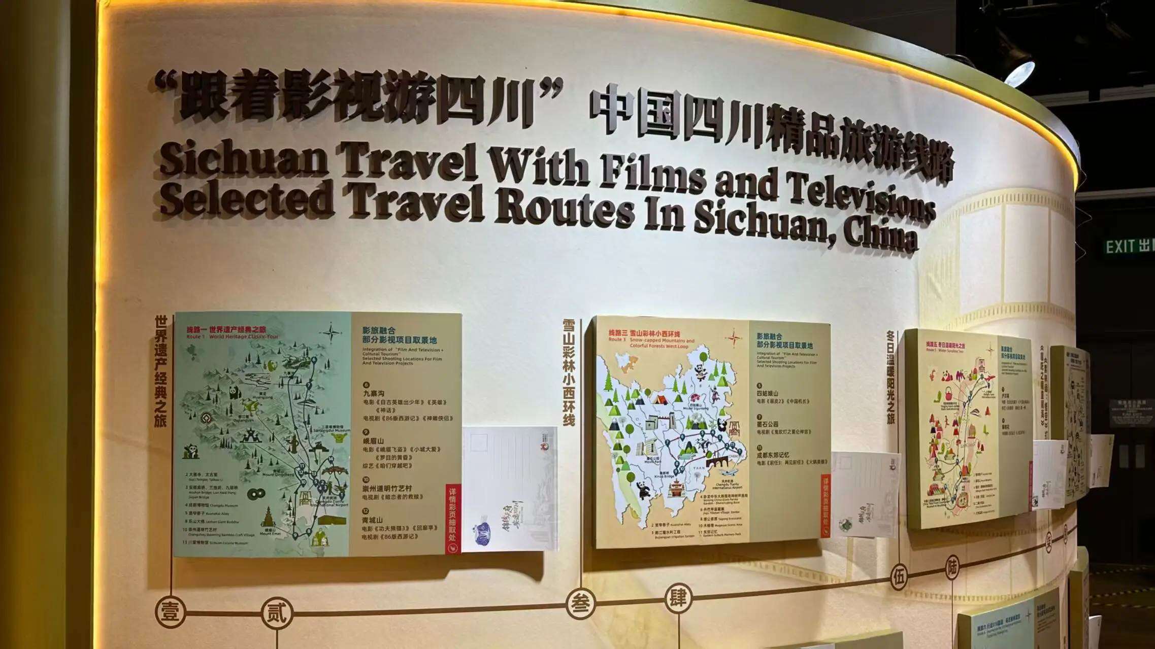 走进四川馆,仿佛一脚踏进了“光影隧道”。左手边,电子屏上《哪吒之魔童闹海》中太乙真人的道场江油窦圌山云雾缭绕;右手边,《黑神话:悟空》取景地安岳石刻的千年紫竹在风中轻摇。屏幕下方,一条蜿蜒的“318国道”线路图将川西高原的壮美风光一一铺陈——新都桥的秋色、稻城亚丁的雪山、理塘的草原,引得几位自驾爱好者当场掏出手机计算行程。