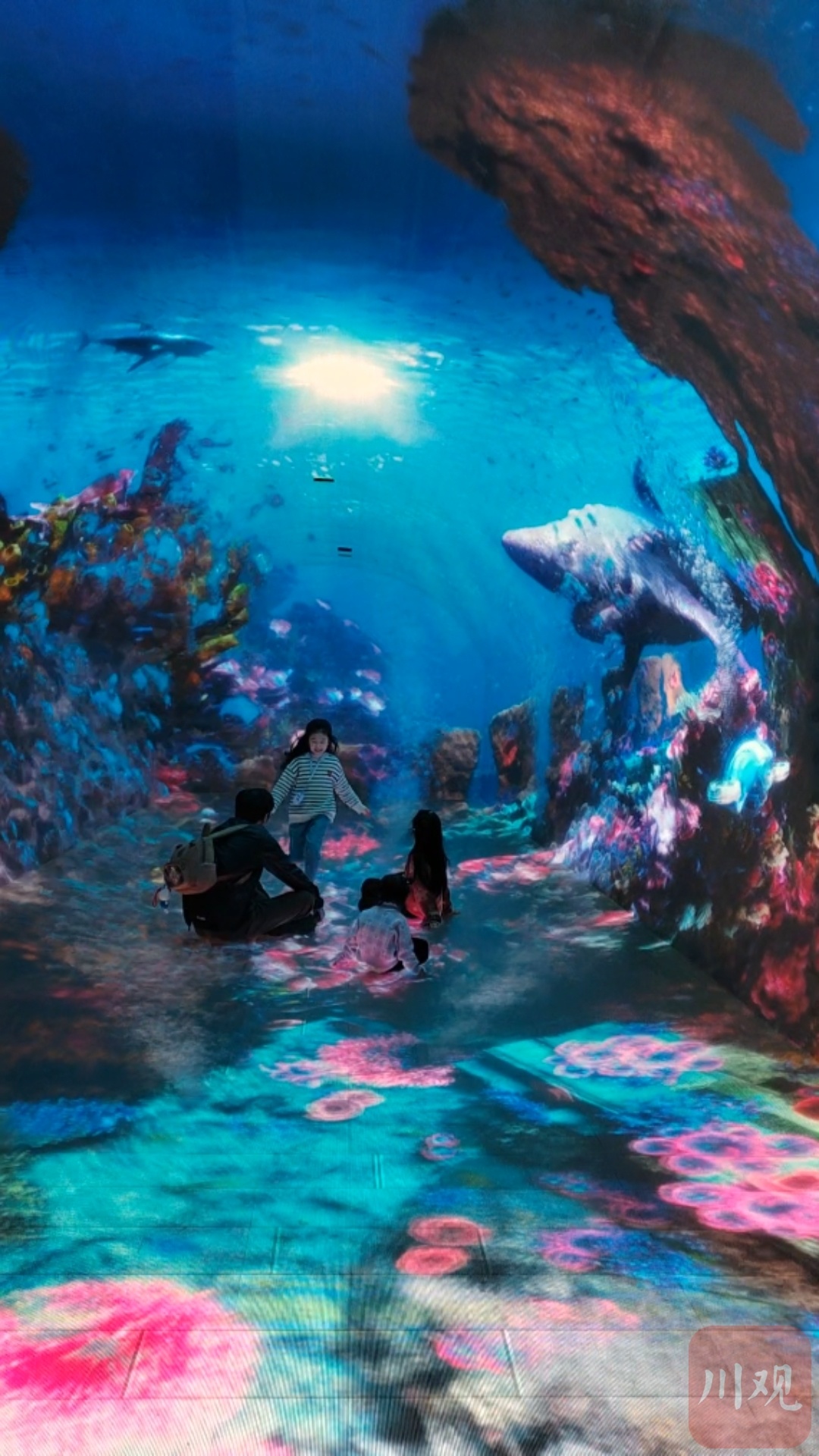 记者在现场看到,不少小朋友和家长漫步其中,时而穿梭在草木葱茏的侏罗纪世界,恐龙在眼前活灵活现;时而遨游在浩瀚星空,璀璨的粒子光束如流星雨般倾泻而下;时而又潜入深海,五彩斑斓的海洋生物擦身而过。