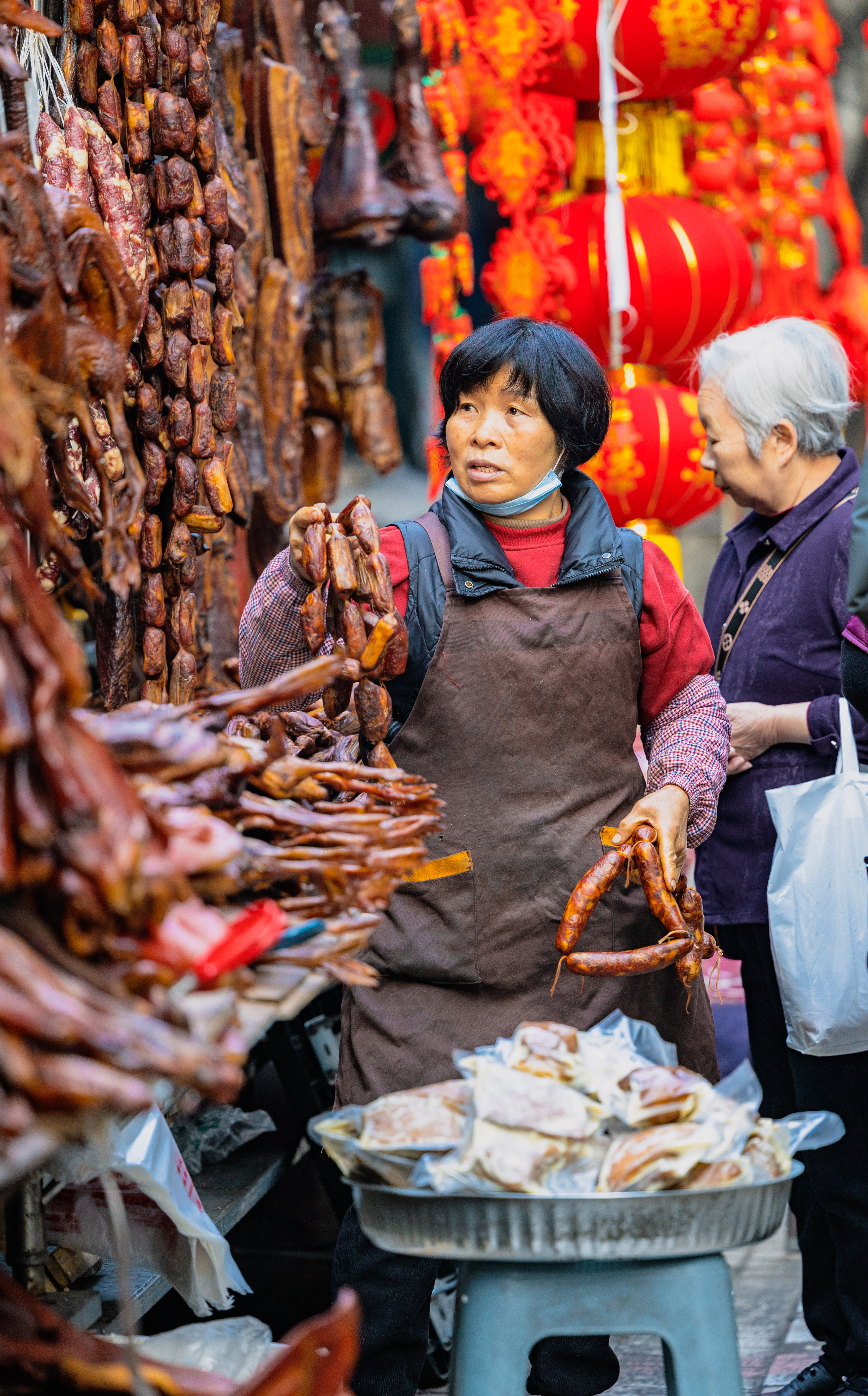 走进西海岸菜市场,迎面而来的是鲜活的气息与鼎沸的人声。摊位上,各类水果蔬菜堆成小山,琳琅满目,肉类区挂满色泽诱人的香肠腊肉,除了日常鲜肉,风味各异的腊肉、腊肠也迎来销售高峰,成为市民备货的偏爱。