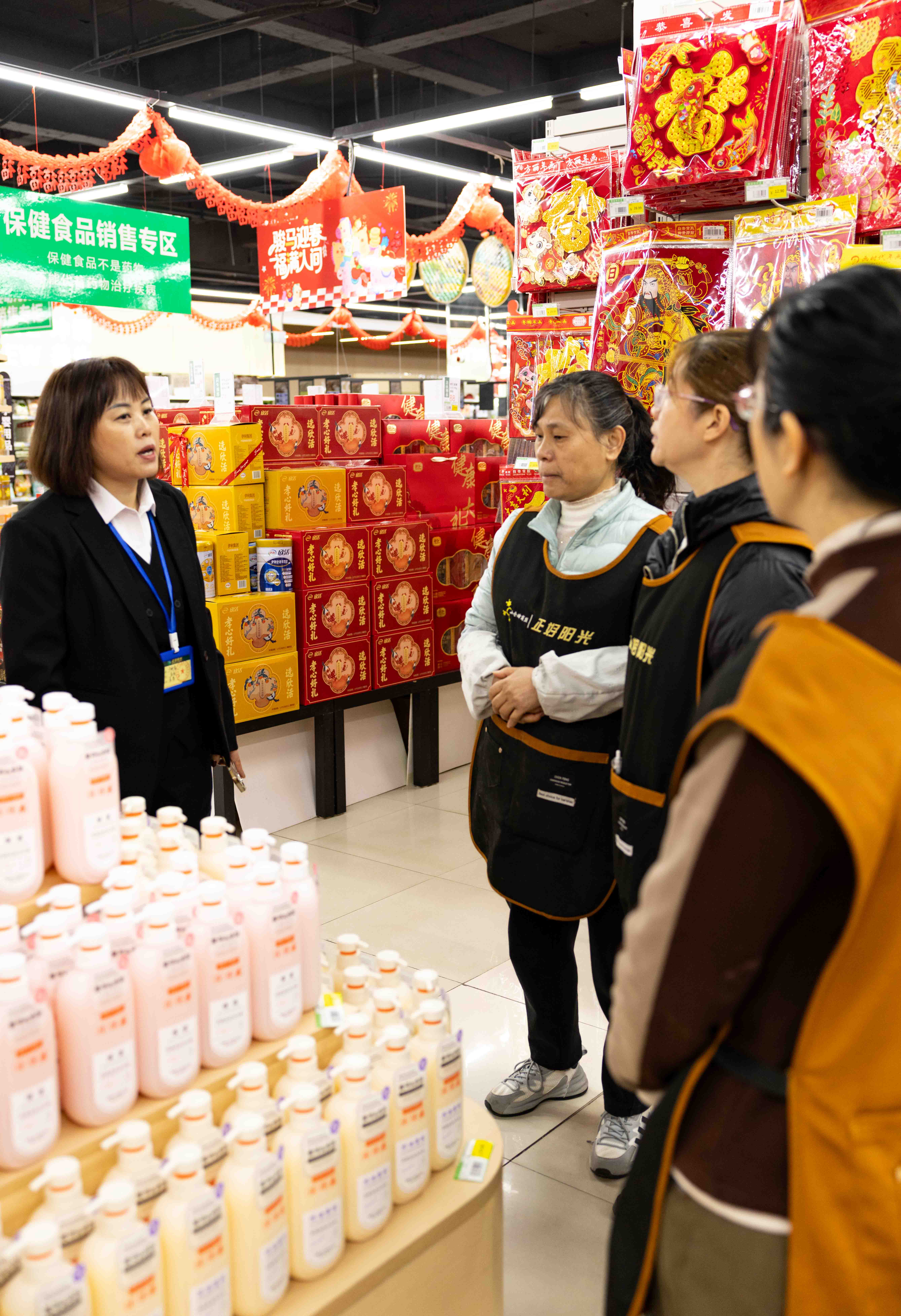 市民谢方梅的购物车里装着春联和孩子爱吃的零食。“提前买好,过个好年!”她笑着说。正在挑选鲜货的市民毛桂华表示:“多买点给老人孩子,再备些礼品,欢欢喜喜过新年!”卖场内补货、导购等工作有序开展,处处洋溢着春节前的忙碌与喜悦。