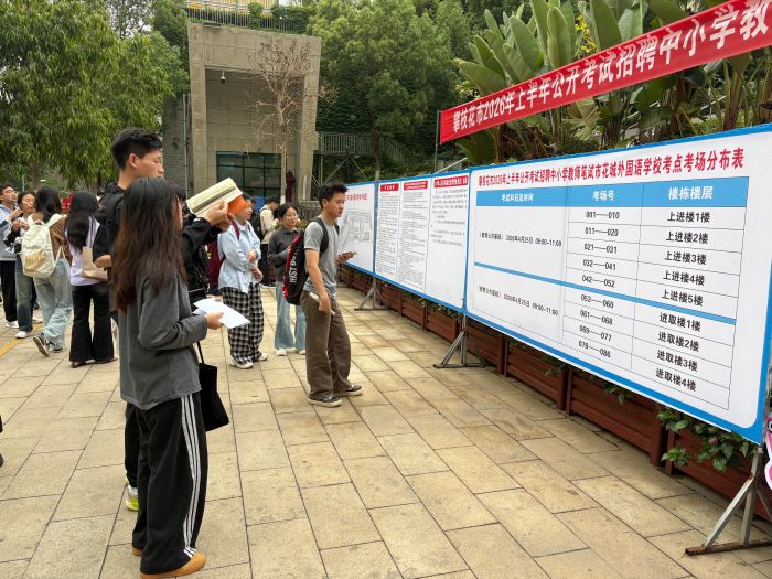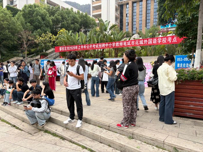 4月25日上午,攀枝花市2026年上半年公开考试招聘中小学教师笔试举行,市花城外国语学校考点,考生等待入场 攀枝花市融媒体中心记者 薛琪舰/摄