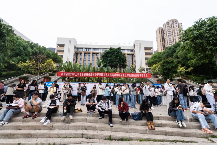 4月26日上午,四川省2026年上半年全省事业单位公开招聘工作人员笔试举行,攀枝花考区市花城外国语学校考点,考生等待入场 攀枝花市融媒体中心记者 车东洪/摄