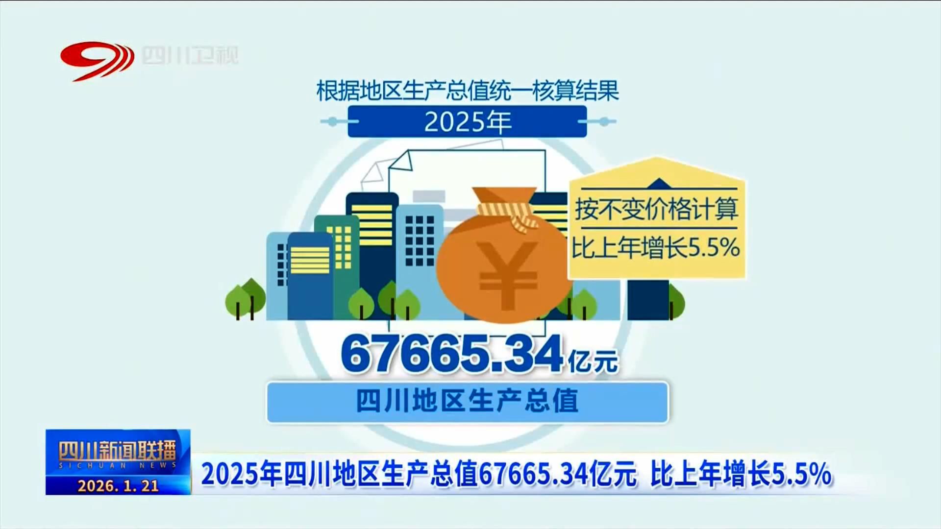 根据地区生产总值统一核算结果,2025年四川地区生产总值为67665.34亿元,按不变价格计算,比上年增长5.5%。分产业看,第一产业增加值5751.35亿元,比上年增长3.7%;第二产业增加值23260.22亿元,比上年增长4.9%;第三产业增加值38653.77亿元,比上年增长6.1%。