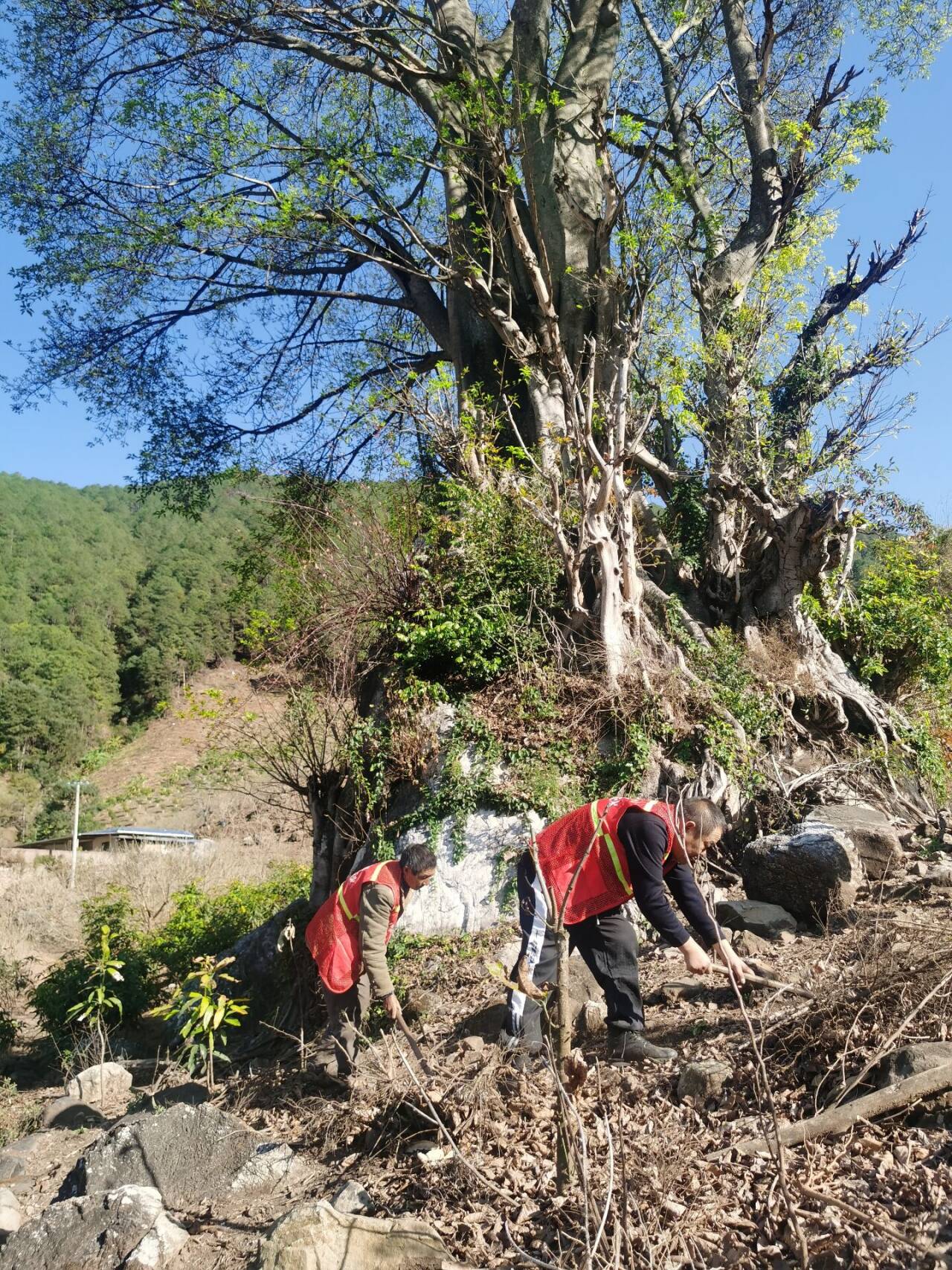13日下午4时40分,一场清除易燃、可燃杂草、树叶的劳动在黄桷树下火热开展,巡山护林队员、村民们很快在大树周围开辟出直径100米的防火隔离带……