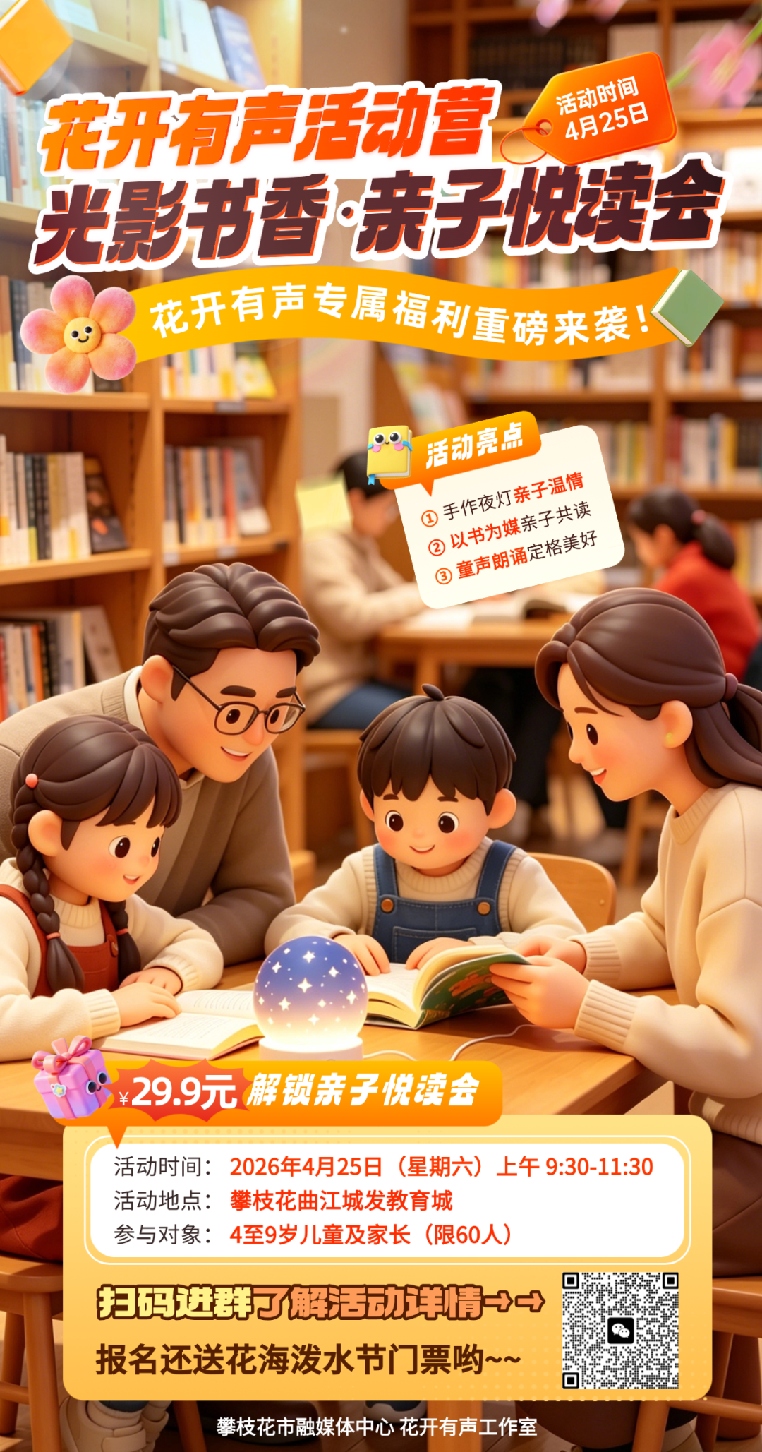 4月25日上午,在攀枝花曲江城发教育城,解锁手作、阅读、朗诵三重乐趣,在陪伴中滋养心灵,在互动中升温感情,给孩子一个充满爱意与书香的周末!❤️