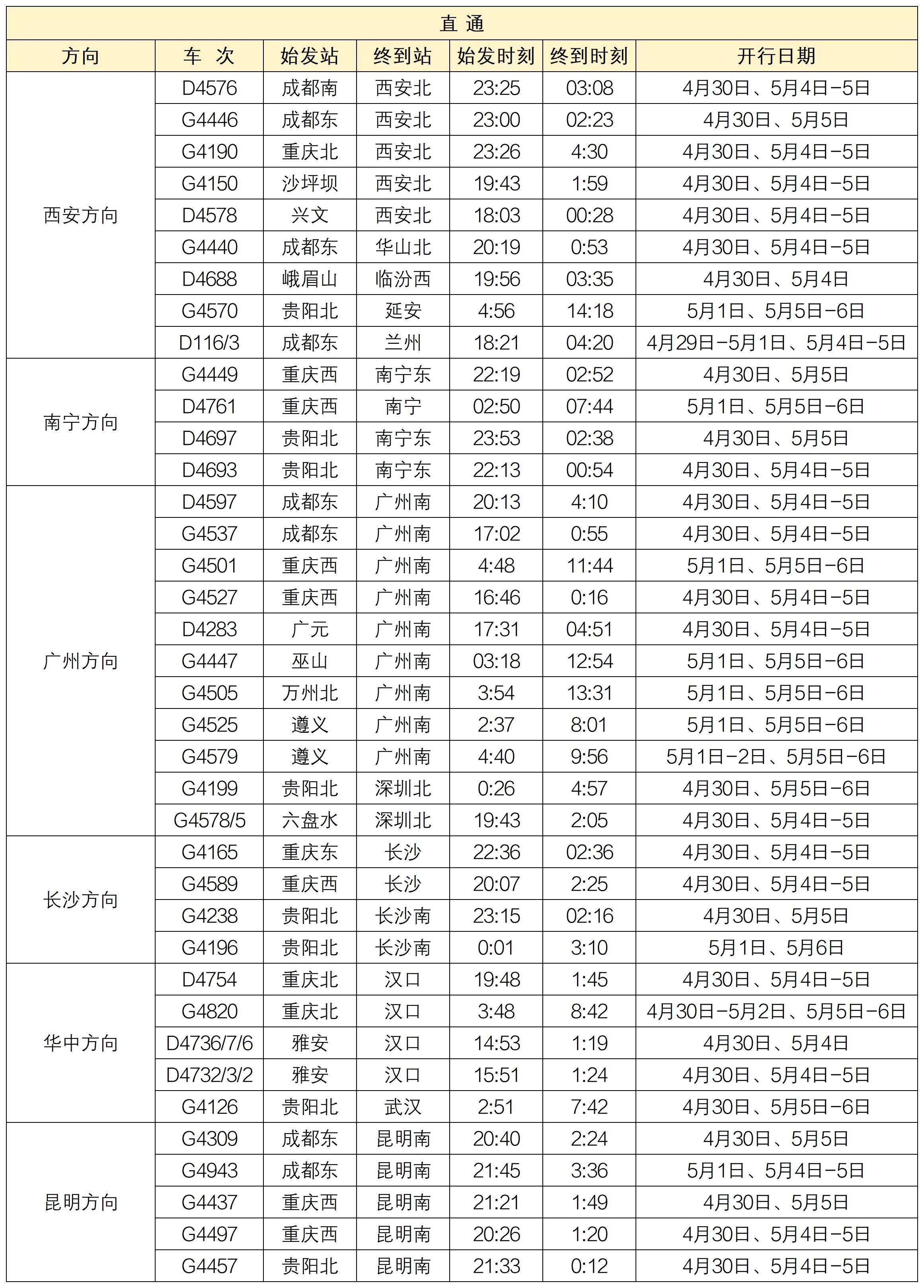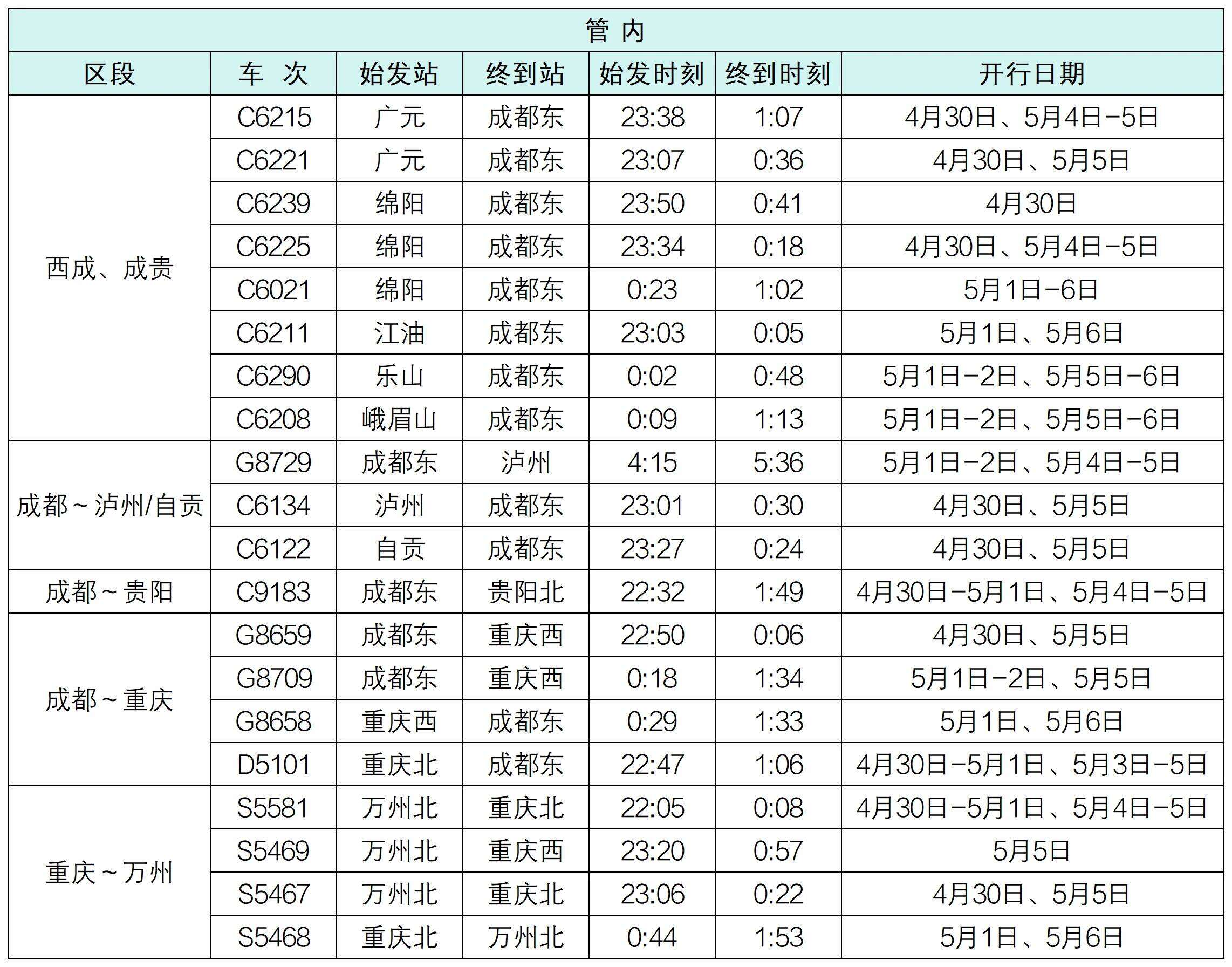 据悉,为全力做好五一假期铁路运输服务保障工作,成都局集团公司精准研判川黔渝“两省一市”客流特点,科学制定运输方案,动态实施“一日一图”,通过突出重点、动态优化、错峰补能、夜动助力等方式,按梯次投放运力,计划开行旅客列车1077对,同比增加35对;增开旅客列车243对,同比增加31.5对,比2026年清明假期增加26对。