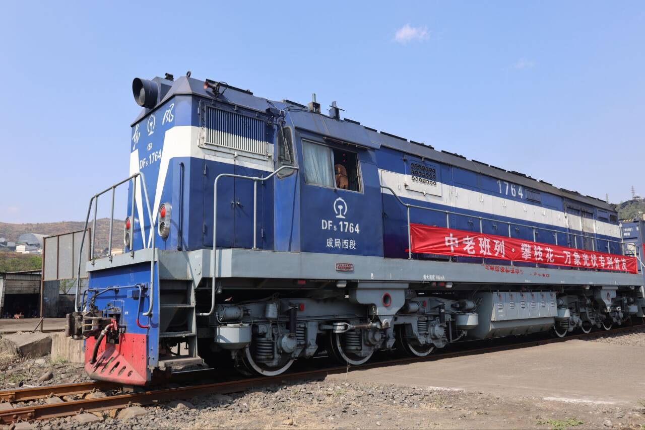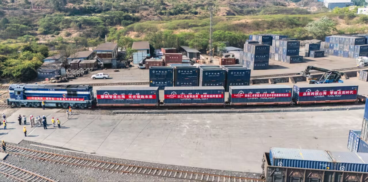 3月17日上午11时许,攀枝花市国家钒钛高新区迤资片区的铁路专用线上,随着一声长鸣,挂着“中老班列·攀枝花—万象光伏专列首发”红绸带的货运火车,装载着10个集装箱、300吨智能光伏支架缓缓驶出,发往老挝万象。