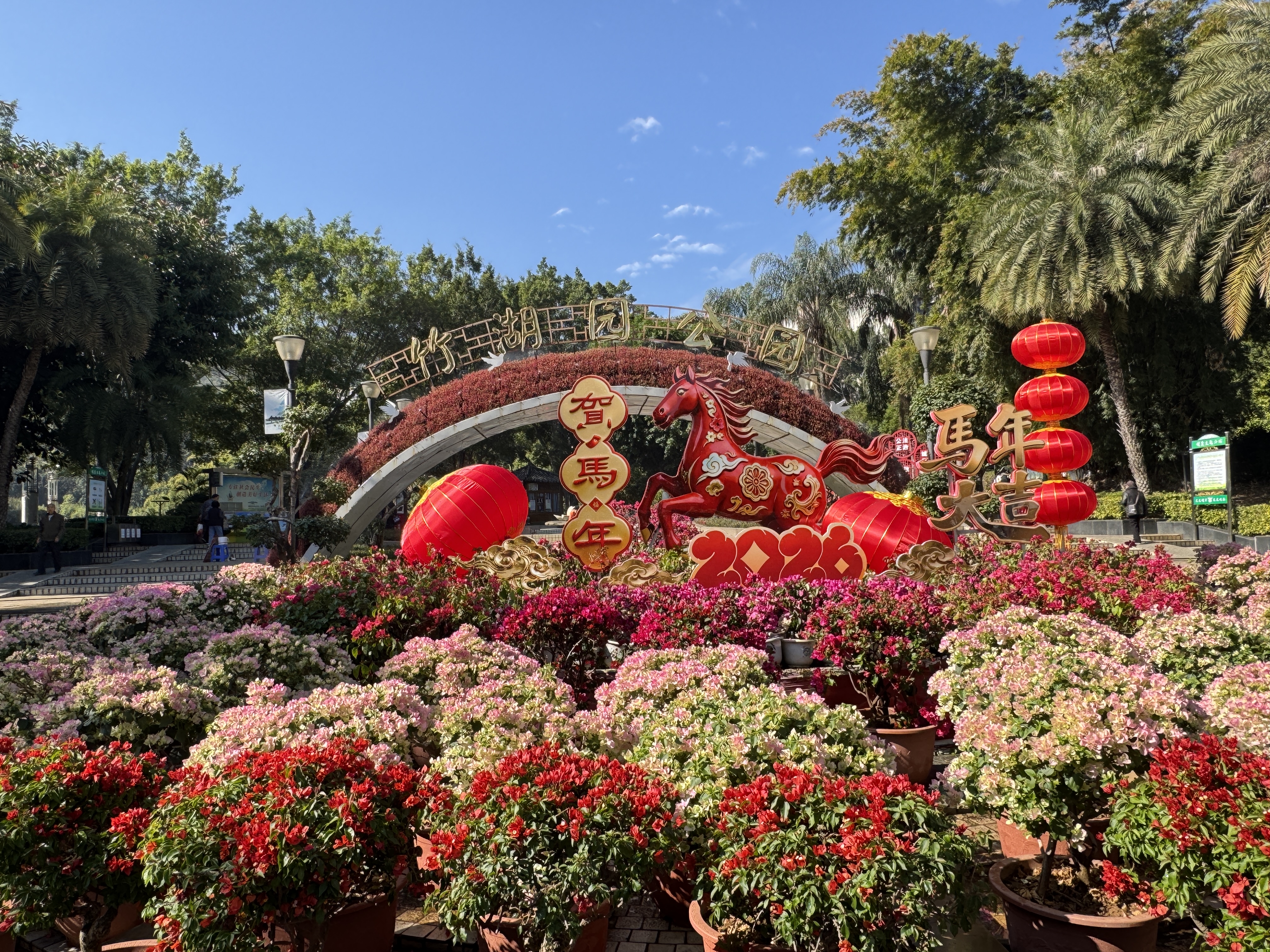 景观设计注重文化融合,突出马年生肖元素,以红、黄为主色调,结合灯笼等传统符号,在竹湖园打造沉浸式园林小景打卡点,让市民在赏景中感受民俗魅力。截至目前,已更换摆放三角梅等花卉约12800余盆,制作主题造型4组,悬挂灯笼80余个。全部布展工作完成后,将为市民营造喜庆祥和的节日氛围。