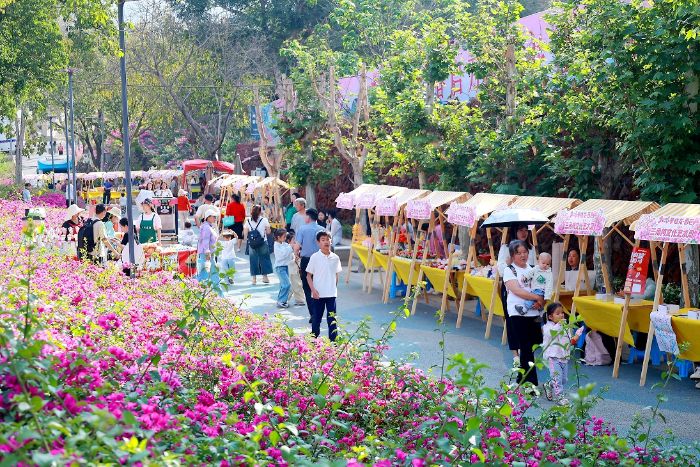 在河门口公园的精品三角梅展区,集中展示特色品种、造型盆景、花艺造景、花墙花廊、主题花艺装置,设置品种科普牌,普及三角梅文化与养护知识。承办方有关负责人说:“我们结合园林景观,打造了沉浸式赏花打卡点,还搭配了灯光亮化来提升夜间观赏效果。”