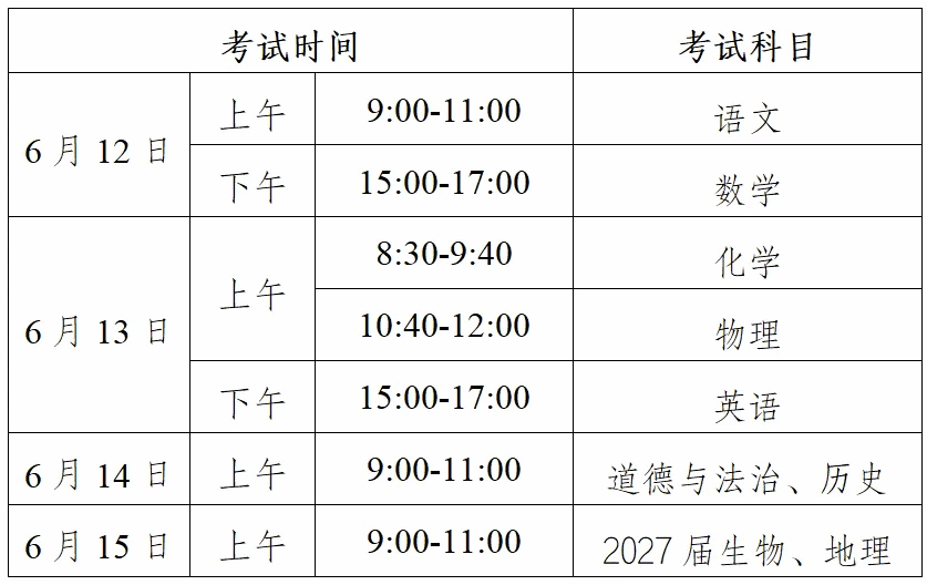 6月15日:上午9:00-11:00考生物、地理(2027届初二年级)。