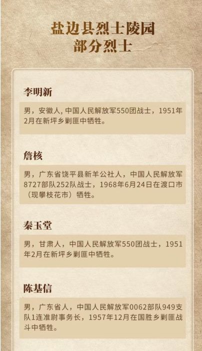 近日,攀枝花市“缅怀先烈 致敬英雄”清明烈士寻亲活动传来消息:经攀枝花、广东饶平两地退役军人事务部门协同核查,最终确认攀枝花市盐边县烈士陵园安葬的詹核烈士,与饶平县记载的詹黑烈士为同一人。目前已成功找到烈士亲属,帮助英烈圆了“回家”梦。