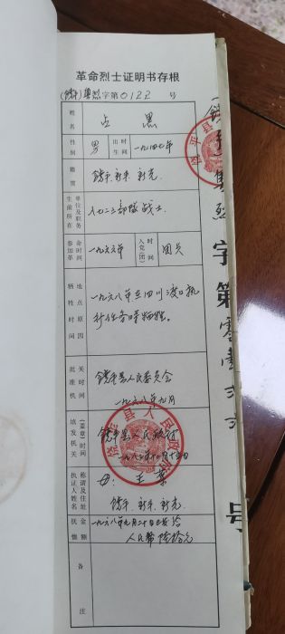 盐边县烈士陵园留存的詹核(詹黑)信息