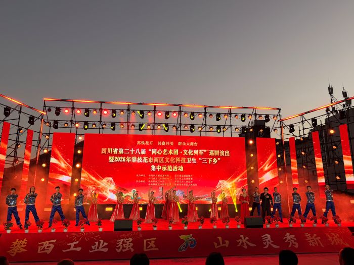 2月10日下午,四川省第二十八届“同心艺术团·文化列车”巡回演出暨2026年攀枝花市西区文化科技卫生“三下乡”集中示范活动在金沙公园开展,把健康、文化、科技送到市民“家门口”。
