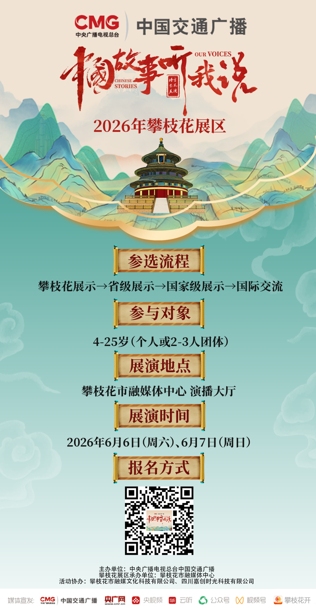 本次展演由中国交通广播主办,为语言爱好者成长赋能。无论是懵懂的幼儿,还是意气风发的青年,只要你热爱语言、敢于表达,只要你想讲好攀枝花故事、中国故事,就别犹豫,快来报名,解锁你的语言高光时刻!