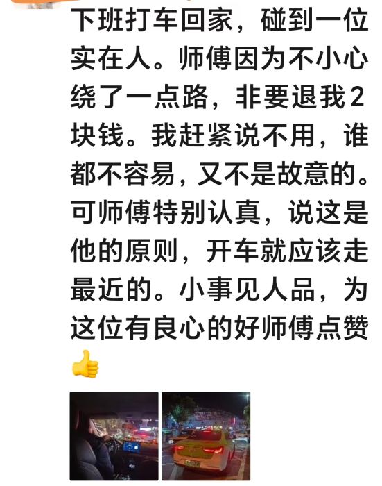 下车后,黄女士拍下了车牌,并将这段经历分享到微信朋友圈,字里行间满是对这位师傅的敬佩:“下班打车回家,碰到一位实在人。师傅因为不小心绕了一点路,非要退我2块钱。我赶紧说不用,谁都不容易,又不是故意的。可师傅特别认真,说这是他的原则,开车就应该走最近的。小事见人品,为这位有良心的好师傅点赞!”