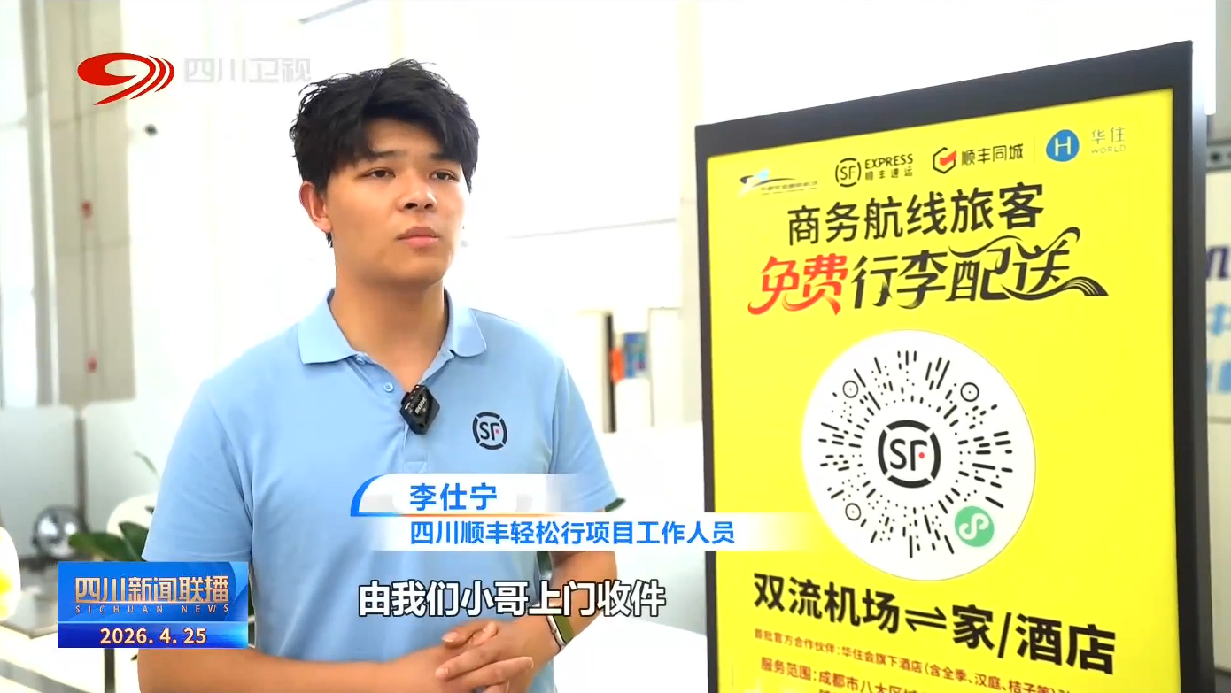 四川顺丰轻松行项目工作人员 李仕宁:至今已有三万单,没有一单客诉。(旅客)在酒店下单之后,由我们小哥上门收件,收件后放到T1或T2航站楼,那(旅客)一家游完之后就可以直接来航站楼提取行李,解决了他们行李携带不便的问题,提升了他们的舒适体验。