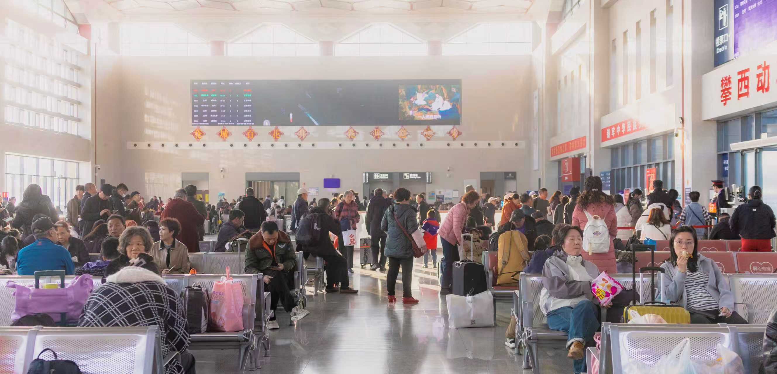 候车大厅,温情流淌,行囊里塞满了对家人的祝福,有攀枝花的水果、蔬菜,甚至还有人把猪肉急冻了带回家。