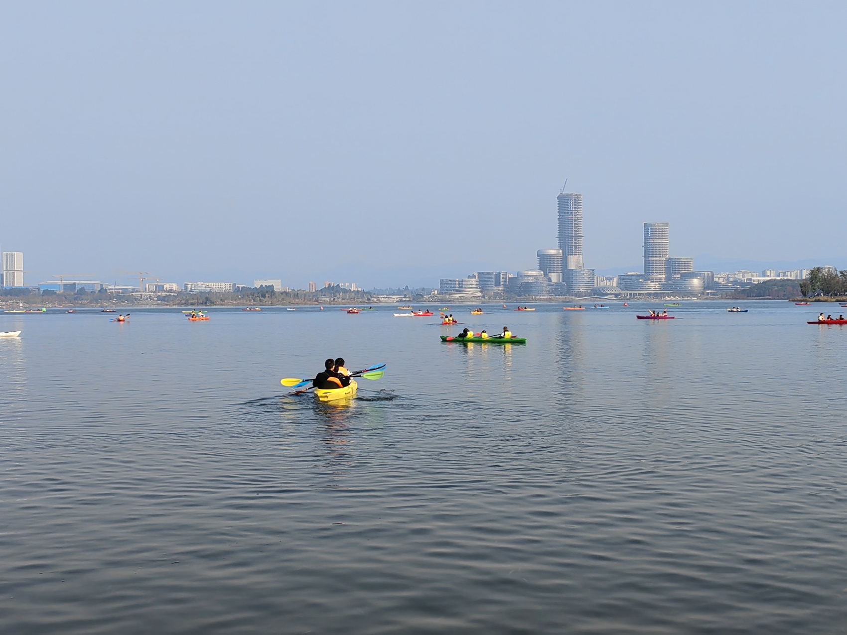 游客在成都兴隆湖划皮划艇。新华社记者 董小红 摄
