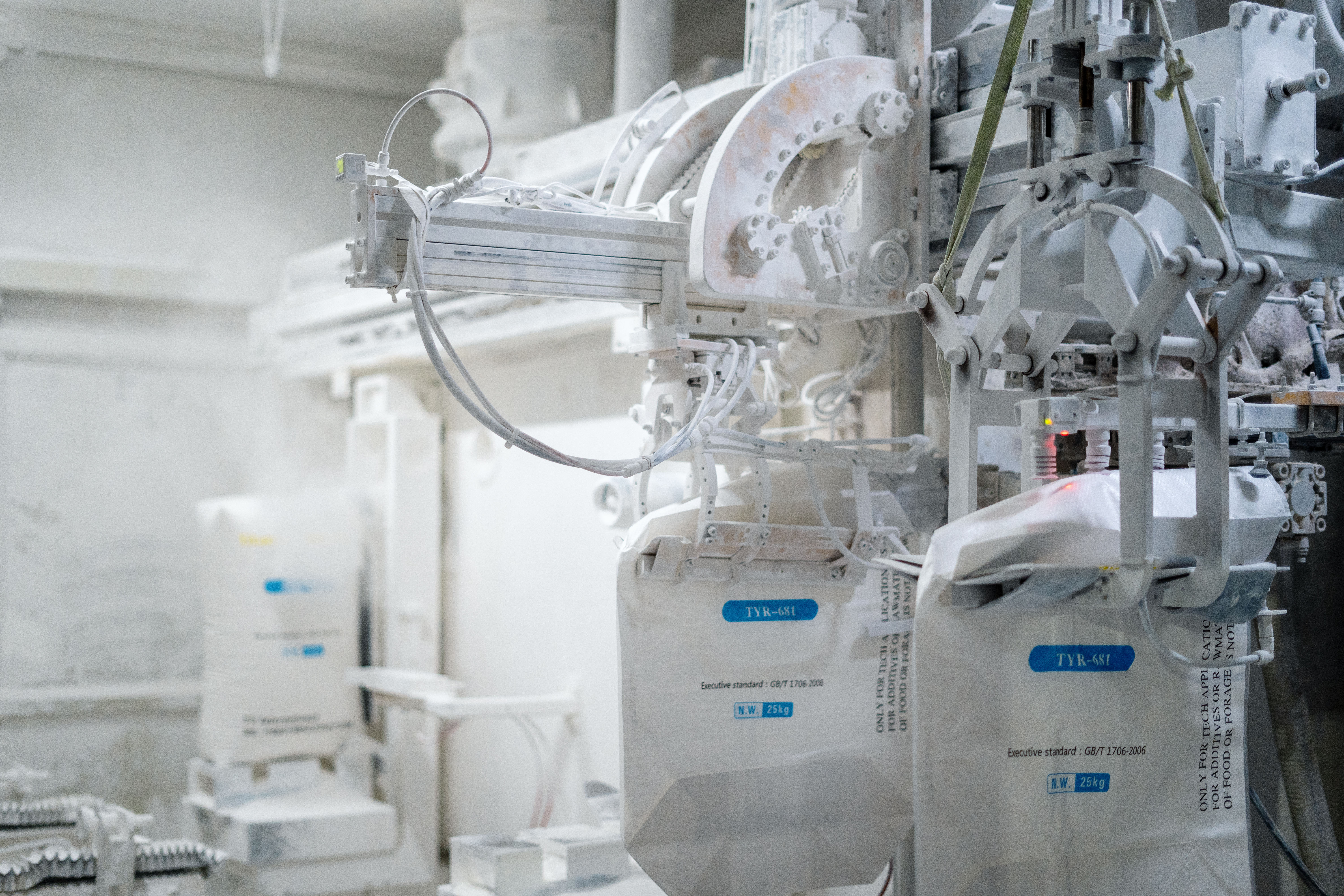 钛白粉自动包装车间布置着智能生产线,实现了全流程无人化作业;成品车间里,装卸车来回穿梭,将一袋袋钛白粉运往装货区。