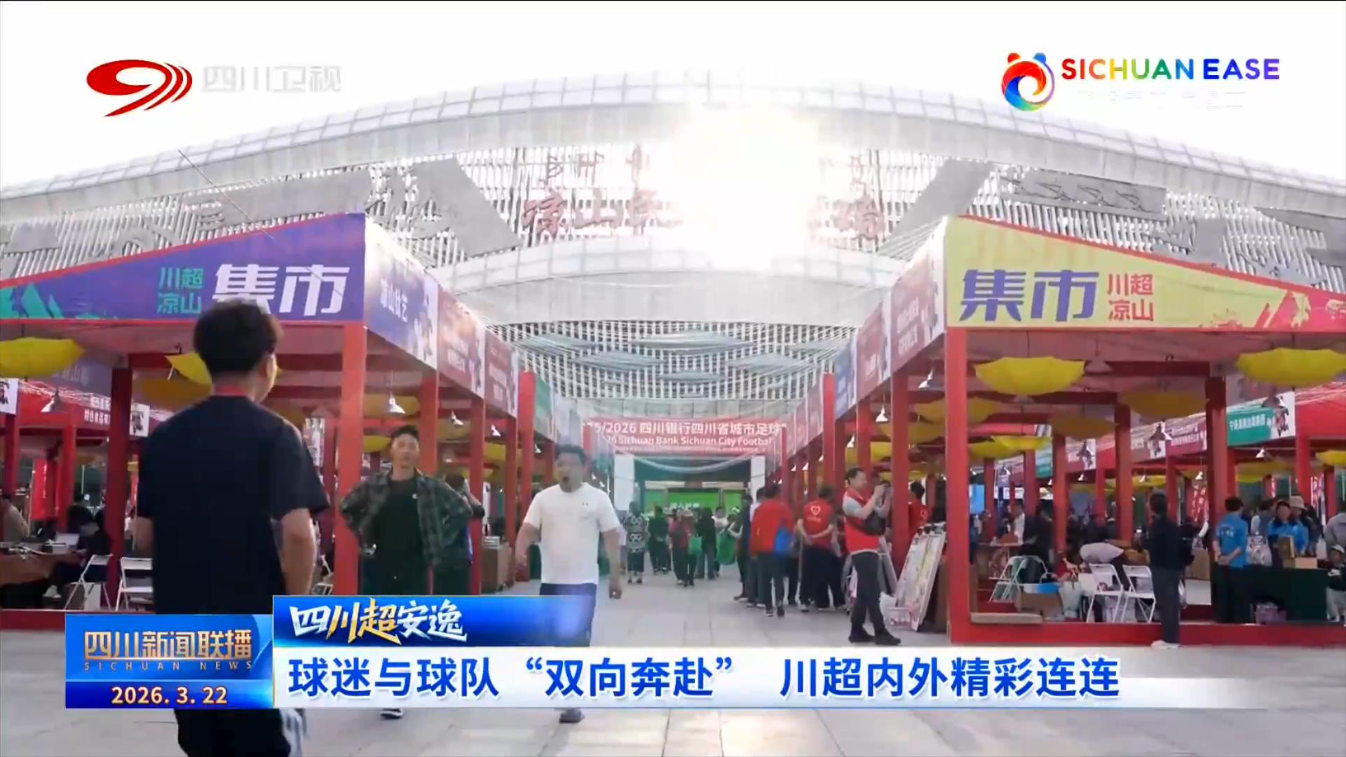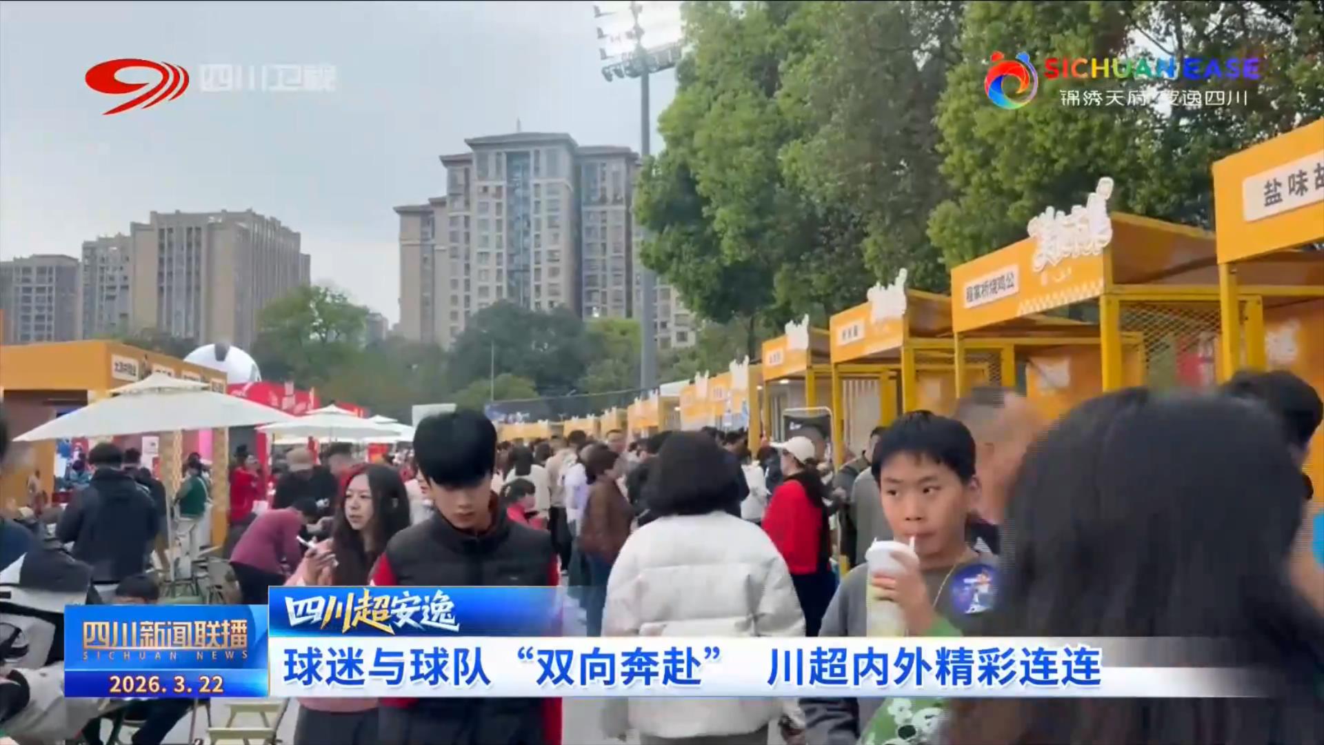 而赛场上的火热也一直延伸到场外。成都双流体育中心“川超”足球嘉年华现场人潮涌动,来自成都、自贡的商家齐聚这里,为球迷们提供吃喝玩乐“一站式”服务。“川超”凉山集市也呈现出一片热闹景象,特色展位依次排开,从地道的农特产品到精美的文创手工艺品,琳琅满目,吸引了游客和市民参观、选购。