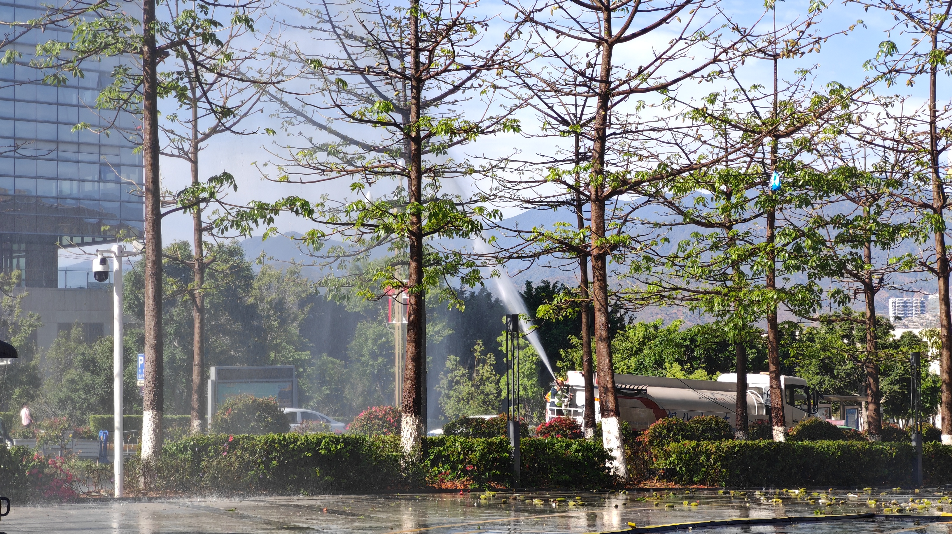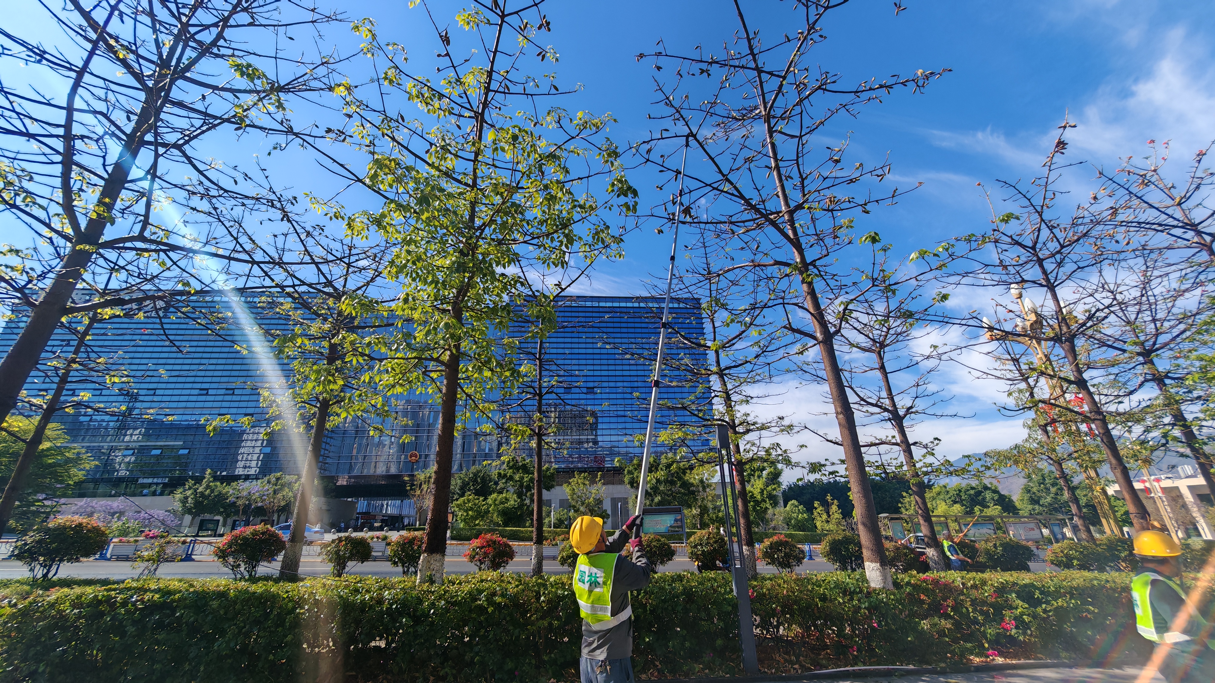 工作人员为木棉“摘果除絮”,以精细治理守护城市春色与民生温度。