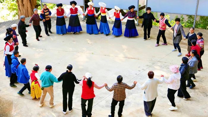 祈福仪式过后,民俗文化活动广场成了欢乐的海洋。伴随着极具民族特色的旋律,大家手拉手围成圈,跳起了“打衣舞”“采桑舞”。舞步轻盈欢快,歌声婉转嘹亮,男女老少皆参与其中,脸上洋溢着幸福的笑容。淋漓尽致的热情与豪爽,彰显着仡佬族人民对生活的热爱。