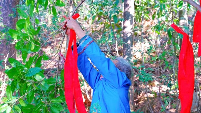 当天,“送年节”古老的仪式从收集“百家肉”开始。仡佬族青年们手持掌盘、肩背背篓,挨家挨户收集着村民们递来的一块块寓意美好的肉。这些心意汇聚在一起,象征着仡佬族人世世代代的团结与和睦。随后,他们来到村里的古树前,祈福新年风调雨顺、五谷丰登。