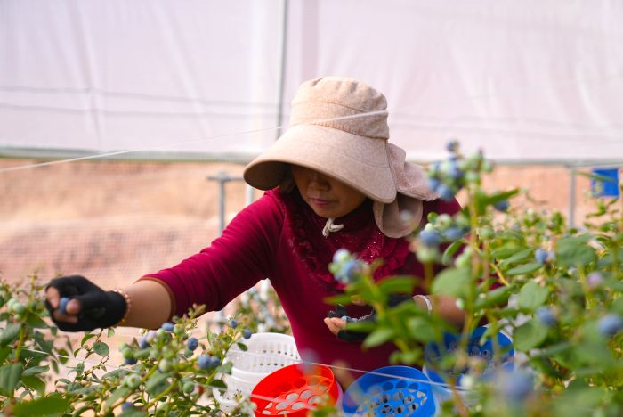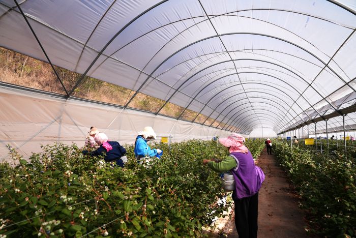 午后阳光洒在蓝莓树上,果实表面的果粉仿佛一层薄霜,这是高品质鲜果的标志。工人们穿梭其间,动作熟练。这些蓝色浆果,曾是新产业探索的起点,如今作为“名特优新”目录中的一员,正带着更高的品质标准与市场期许,走向更远的地方。