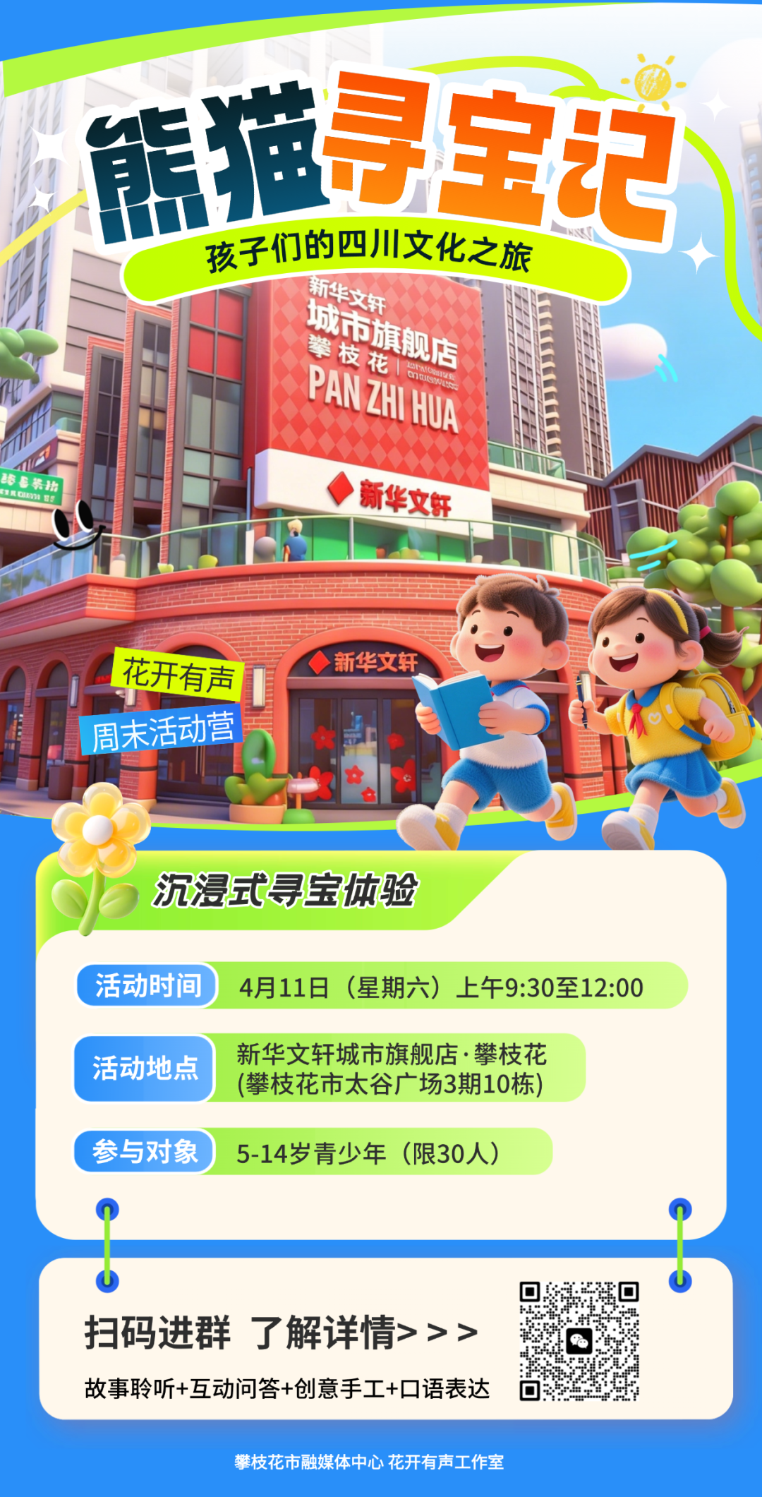 花开有声活动营联合新华文轩城市旗舰店·攀枝花,重磅推出花开有声周末活动营——熊猫寻宝记:孩子们的四川文化之旅,专为5-14岁孩子打造,让宝贝们在阅读、互动、手工中,读懂四川文化,收获成长与快乐!