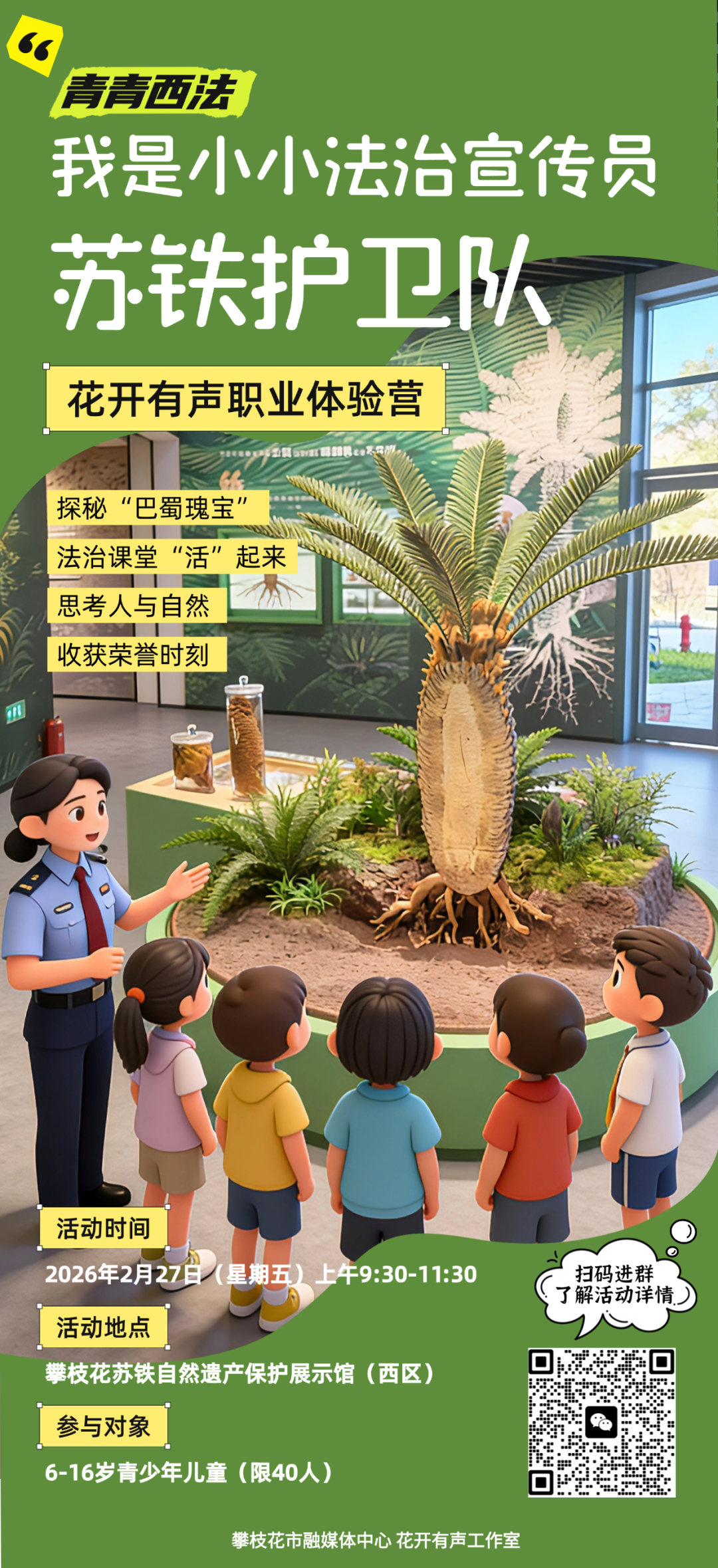 2月27日,攀枝花市西区人民法院与攀枝花市融媒体中心联合打造——花开有声职业体验营之 “我是小小法治宣传员·苏铁护卫队”,现在开启招募!