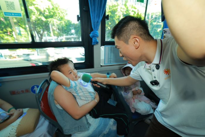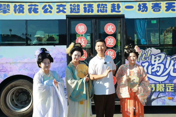 4月11日上午9点,炳三区公交站,一辆车身覆满蓝花楹涂装的公交车准时发动。攀枝花市融媒体中心主持人李震乾举起话筒:“一城阳光——”满车乘客齐声接应:“半城花!”