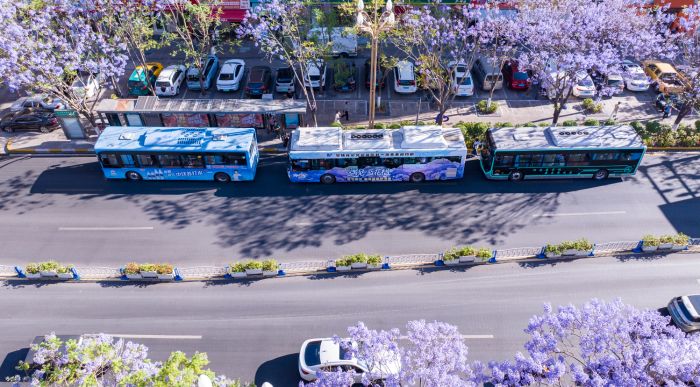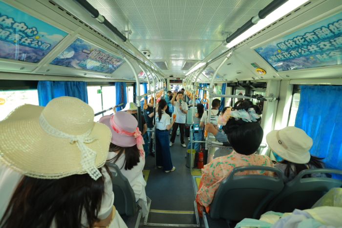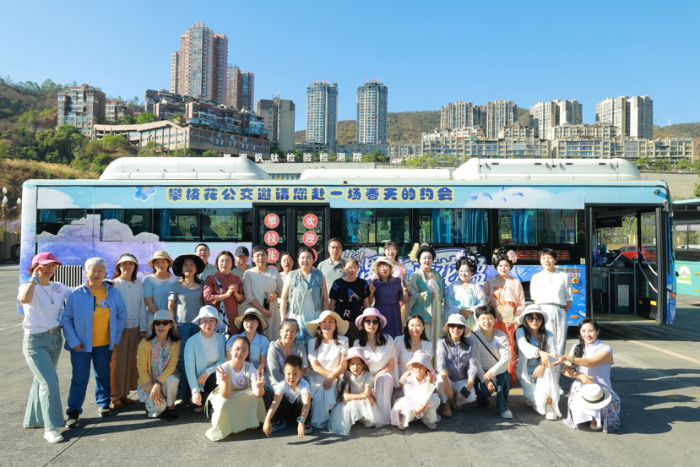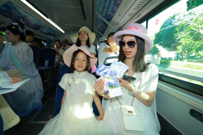 这是攀枝花市融媒体中心联合市公交公司打造的“遇见蓝花楹”赏花专线首发现场。全城独此一辆的主题公交,载着市民穿越三线大道北段那条被称为“紫色大道”的六公里花廊,最终抵达此行真正的目的地,大花地。