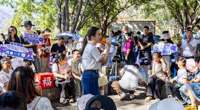 话音落,四大环节轮番登场。本土脱口秀厂牌“钛度喜剧”主理人何瑞林联合攀枝花市融媒体中心主持人易寒为大家带来一段即兴表演,把蓝花楹和攀枝花人的日常糅进段子,还送出20张“钛度喜剧”VIP门票,台下笑声不断。禾也烘焙的甜品桌前排起长队,奶油蛋糕的甜香混着花香,市民端着纸杯在树下拍照。