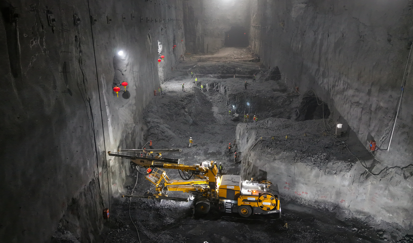 地下厂房作为电站的“动力心脏”,是整个工程的核心枢纽,深埋山体地下约500米处,总长度近200米、高度60米。面对高原施工的多重严峻考验,建设者们依托自主研发的智能建设管理平台,融合BIM建模、三维激光扫描、智能凿岩、智能爆破、智能通风等多项智能化手段,采用“预裂爆破+光面爆破”施工工艺,分层分块开挖推进作业。